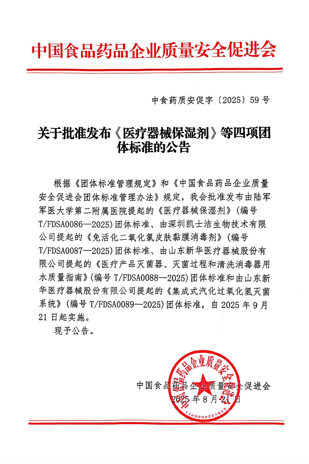 中国食药安全促进会(FDSA)批准发布《医疗器械保湿剂》等四项团体标准